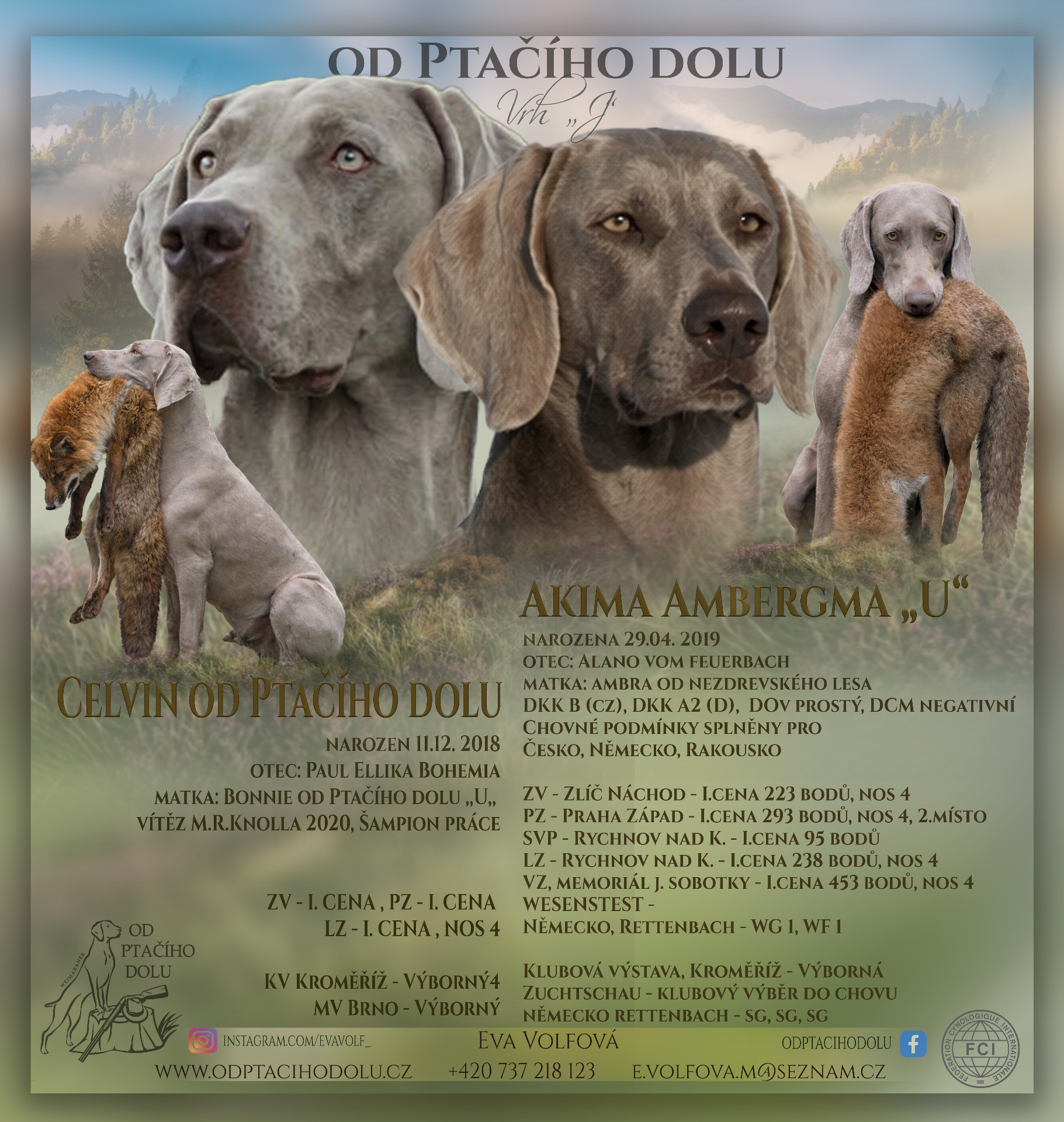 ELLA od Ptačího dolu (*22.01. 2022)zastupovala české výmarany na JUBILÄUMS VOLLGEBRAUCHSPRÜFUNG 2024 (rakouské klubové všestranné zkoušky - VGP) pořádané ÖWV 04. – 05. 10. 2024 v okolí Mailbergu, Dolní Rakousy.ELLA od Ptačího dolu se umístila na 7. místě z celkového počtu 22 ohařů.Celkem Ella získala 387 bodů z možných 410 bodů.Emil Enzo od Ptačího dolu získal celkem 336 bodů. Emil zastupoval německé výmarany.S Ellou jsem šla rakouské zkoušky pěkně stupínek po stupínku. Zkoušky vloh 30.04. 2023 168 +H /168 bodů 2.místoZkoušky pole + voda 08.10. 2023 297/312 bodů 4.místoV letošním roce si Rakouský klub chovatelů výmarských ohařů - Österreichischer Weimaranerverein (ÖWV) připomíná jubilejní 100. výročí od svého založení. Ve sboru rozhodčích již tradičně posuzovali manželé Jana a Martin Kočovi, Petr Buba.